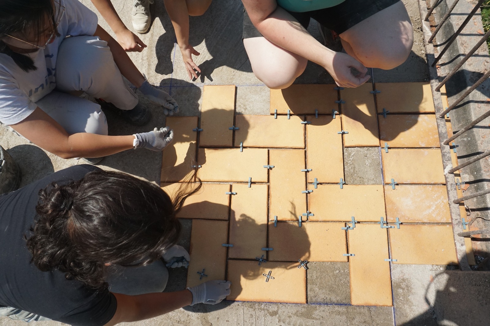 The terrace at the Can Vinyolas building, which is part of the Moli Fondo paper mill complex, had heavily damaged or completely missing tiles. The project focused on reconstructing the terrace using historically correspondent materials such as ceramic rustic tiles and respecting the hatch pattern, and color of the original tiles.